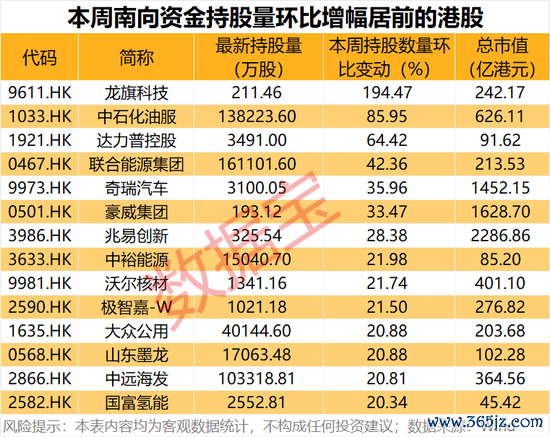 从持股量变化来看,本周14股获得南向资金持股量环比增长超20%,龙旗科技居首,环比增长194.47%;中石化油服、达力普控股、联合能源集团持股量环比增幅居前,环比增幅分别为85.95%、64.42%、42.36%。