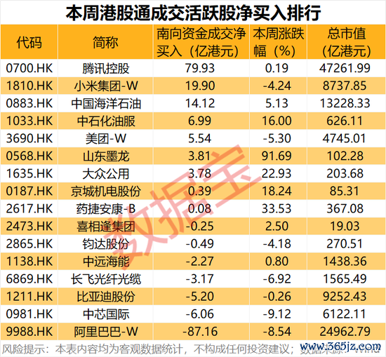 从本周上榜成交活跃股名单来看,共有16只个股上榜,阿里巴巴-W本周港股通合计买卖总额最高,达到476.63亿港元;山东墨龙合计买卖总额405.46亿港元,中国海洋石油、腾讯控股、小米集团-W、大众公用买卖总额均超过200亿港元。