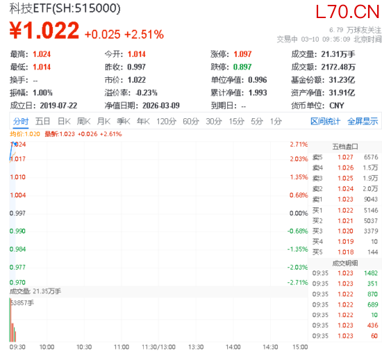 热门ETF方面,国内首只科技龙头先锋——华宝基金科技ETF(515000)场内价格上涨2.61%,成交额达1783.81万元。