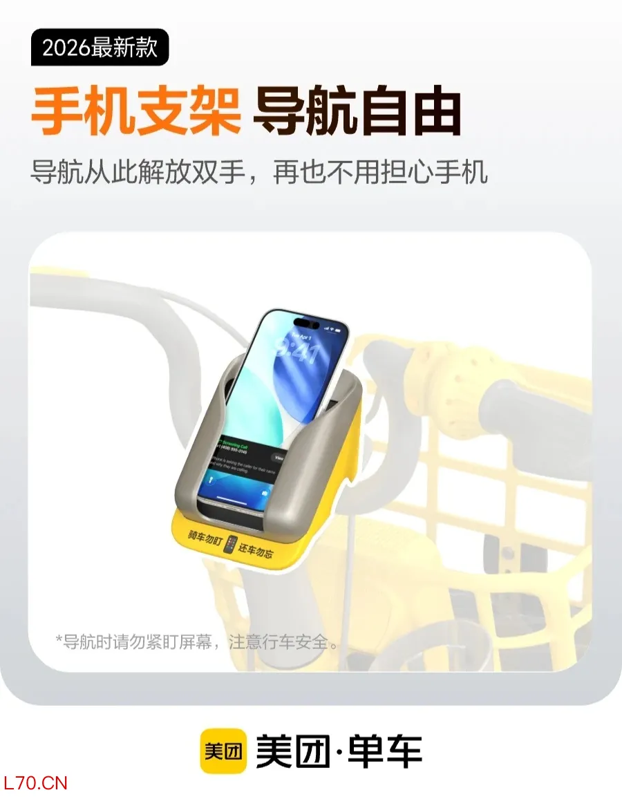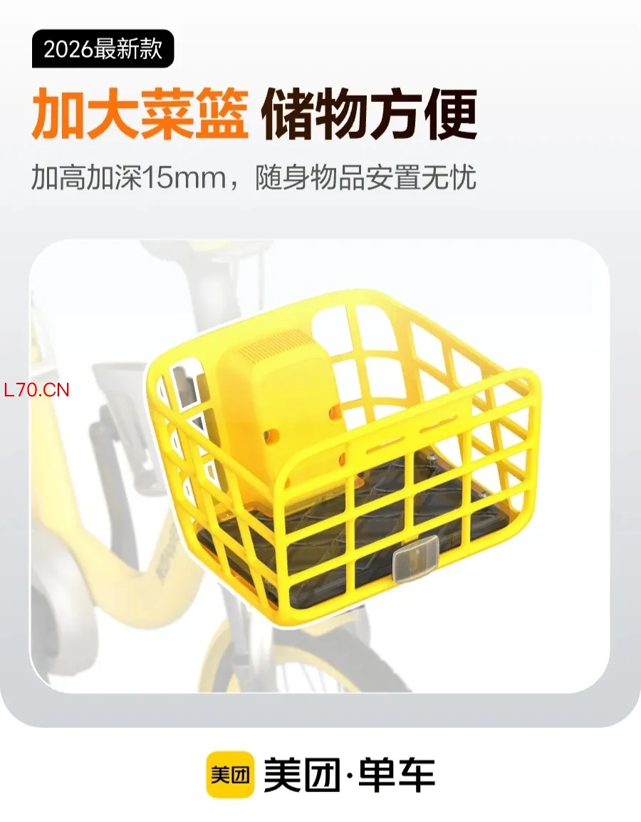 2026 款美团减震单车新增手机支架,方便用户导航;整车采用银色和黄色搭配,链条部分配有保护壳避免裤子蹭到油污证券金融信息服务平台,还加大了菜篮,方便放置更多物品。