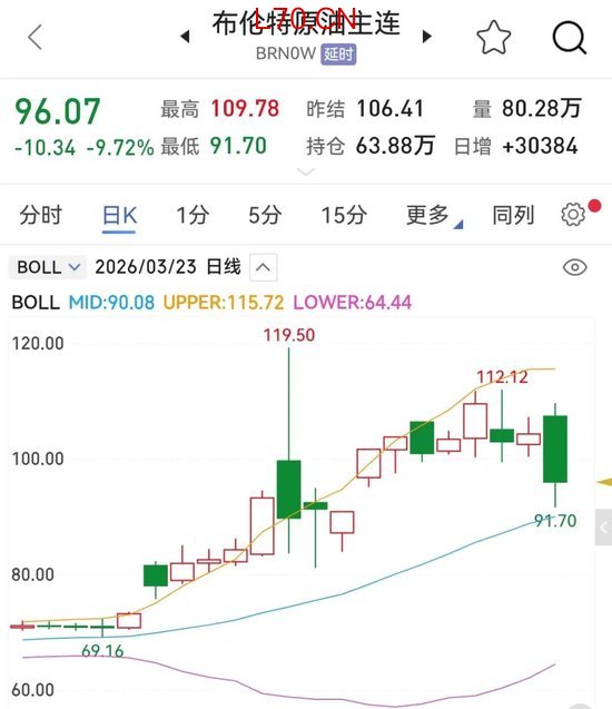 当天早盘,受中东局势持续紧张影响,国际油价延续涨势。伦敦布伦特原油期货价格一度升至每桶113美元以上。此后,美国总统特朗普表示,美国和伊朗在过去两天里进行了“非常好且富有成效”的对话,美国将“推迟5天”打击伊朗发电站。受此影响,伦敦油价一度大跌逾10%,跌破每桶100美元关口。