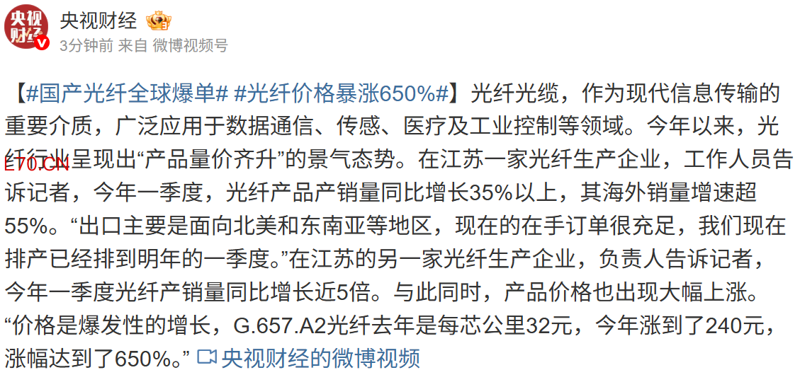 国产光纤全球爆单 部分产品价格暴涨650%国产光纤全球爆单 部分产品价格暴涨650%