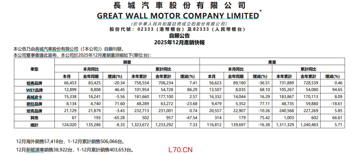 长城汽车:2025年汽车销量为132.4万辆,同比增长7.33%长城汽车:2025年汽车销量为132.4万辆,同比增长7.33%