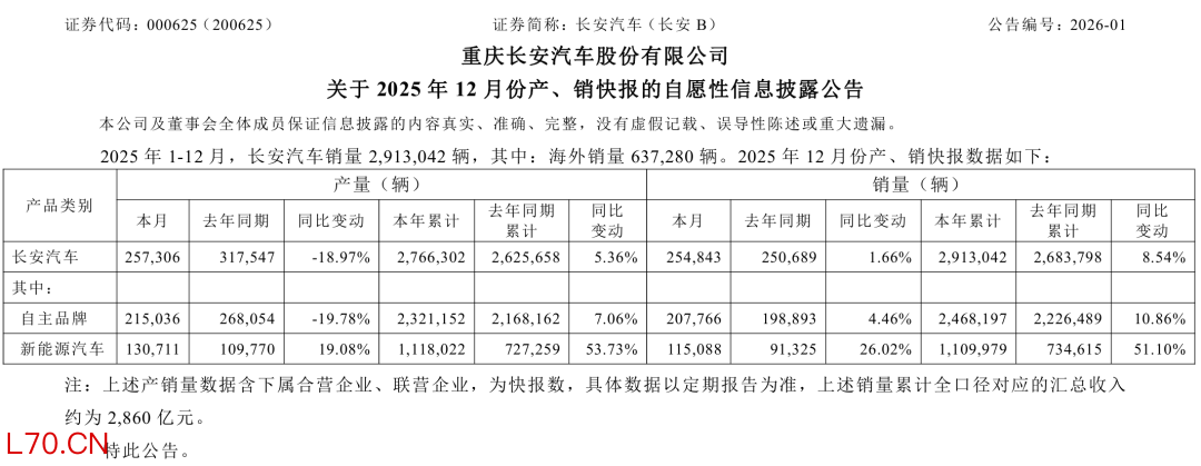 销量层面,2025年全年长安汽车整体表现较为稳健,长安汽车全年累计销量为2913042辆,同比增长8.54%,全年销量创近9年新高。其中,自主品牌销量为2468197辆,同比增长10.86%;新能源汽车销量为1109979辆,同比增长51.10%;海外市场销量为637280辆,同比增长18.9%。