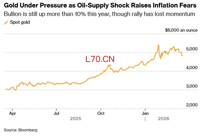 现货黄金价格在1月下旬曾触及5595美元/盎司上方的历史高点;自2月28日战争爆发以来,截至周三收盘,金价已下跌近9%。
