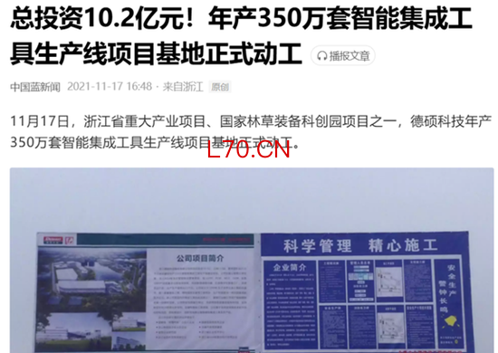 不仅如此,力场君还关注到“中国蓝新闻”此前于2021年11月发布的一篇报道,首先说,这可不是什么小自媒体,这可是浙江广电集团旗下的官方新闻平台,报道标题是《总投资10.2亿元!年产350万套智能集成工具生产线项目基地正式动工》。