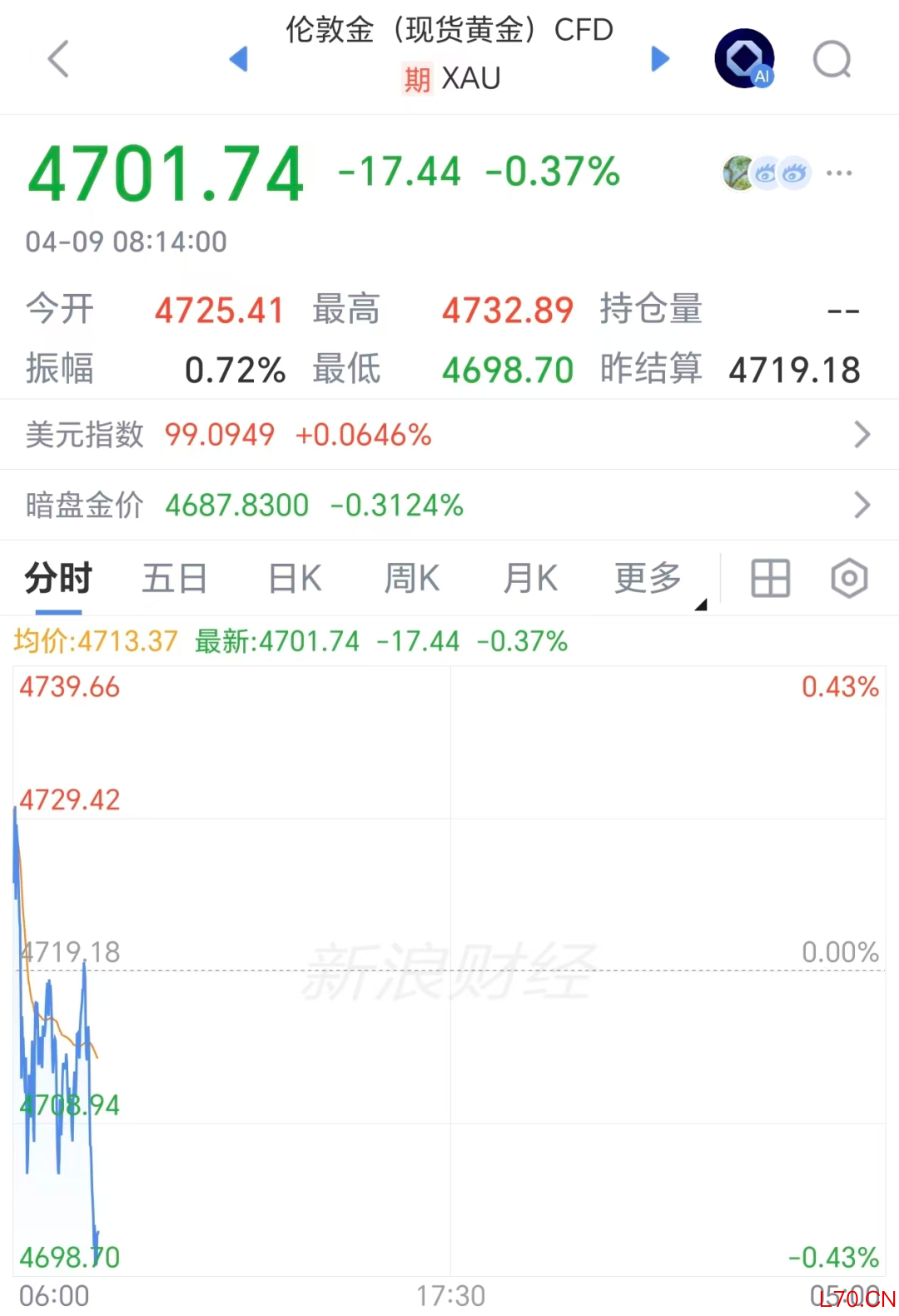 4月9日早上,现货黄金失守4700美元,低至4698.7美元,截至8:14,日内跌近0.4%。COMEX黄金跌近1%,在4730美元上下波动。