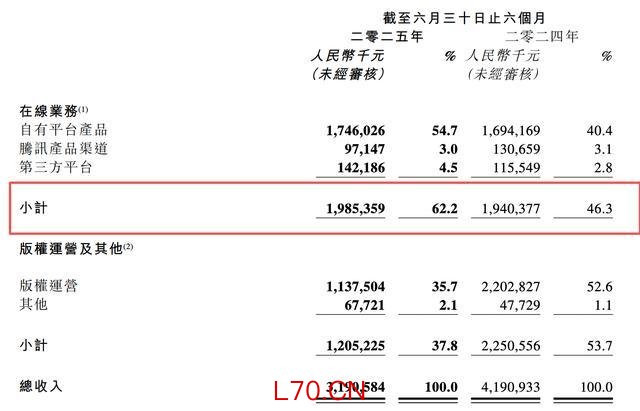 这些IP、作者可以说是阅文集团最宝贵的且别人羡慕不来的财富,剩下的就是这些财富能开发多少的问题了。早些年,IP这门生意还不成熟,阅文可以说是坐在金矿上但不知道怎么挖掘,营收基本来自于网文付费阅读(在线业务基本就是网文付费阅读),即便到2025H1,这块业务都还占公司整体营收的62.2%,当然更多是因为2025没上什么新剧,2024H1这块业务收入占公司整体营收的比重是46.3%。